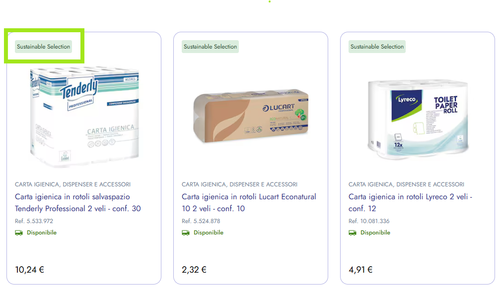 Per semplificare la ricerca e identificare facilmente questi prodotti, è sufficiente navigare nel pannello di sinistra “filtra per” sotto la voce “Sustainable selection”.